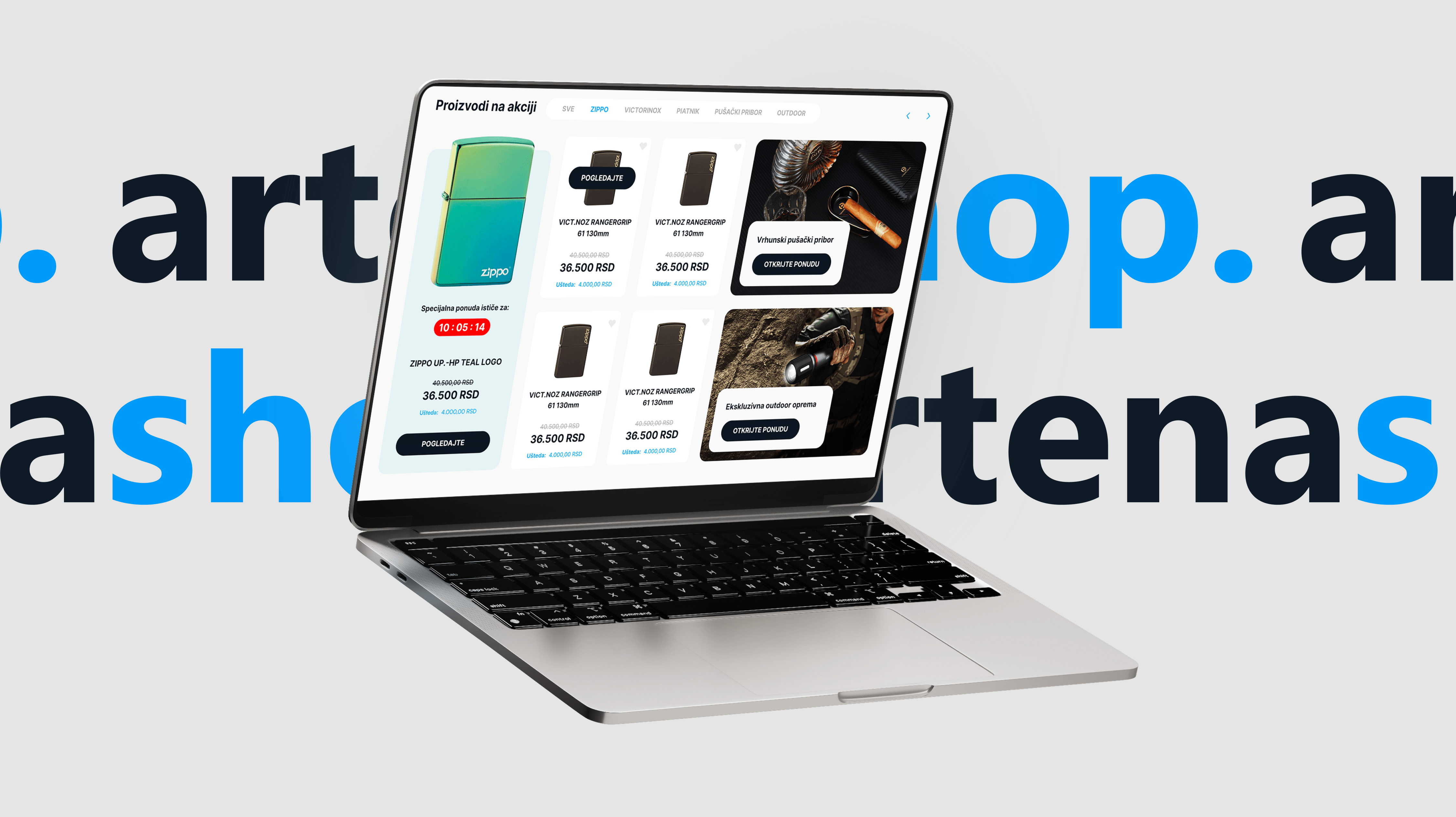Artena Shop je moderna e-commerce platforma razvijena kao logičan sledeći korak nakon 30 godina iskustva u uvozu i distribuciji pažljivo odabranog asortimana renomiranih svetskih brendova poput Victorinox, Zippo i Piatnik. Naš zadatak bio je da osmislimo i realizujemo online prodavnicu koja olakšava proces kupovine kroz moderan UX i uspešno prenosi poruke pouzdanosti, visokih standarda i posvećenosti kvalitetu, vrednosti koje prate brend decenijama.