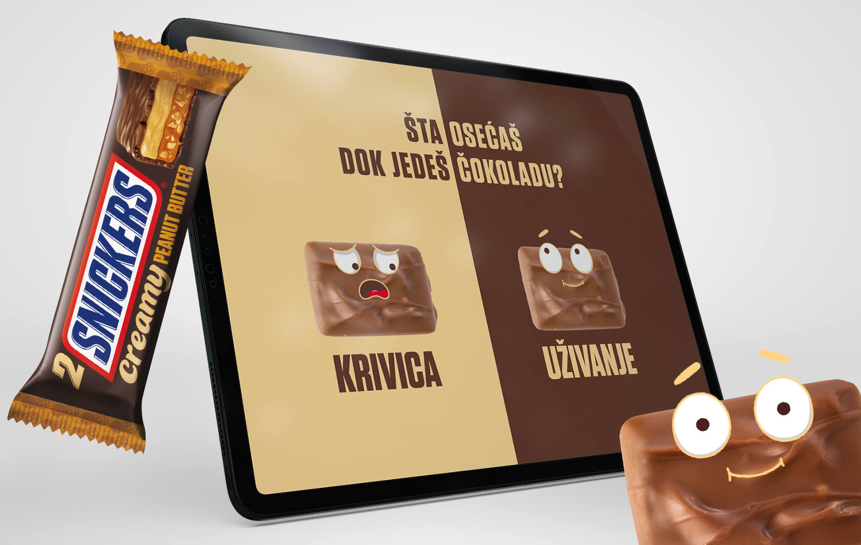 Naše rešenje je zasnovano na ideji da postoje dva tipa ljudi dok jedu slatkiše – oni koji osećaju krivicu i oni koji uživaju bez zadrške. Na šaljiv način, kreirali smo dve „maskote karaktera“, približavajući im novi kremasti ukus Snickers čokoladice sa malo kalorija. Dizajn je u Snickersovim tonovima, podeljen ekran sa dve boje koji vizuelno doprinosi polarizaciji dva tipa karaktera pri konzumiranju slatkiša.